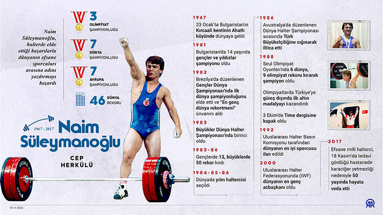 Milli halterci, 1988 Seul, 1992 Barselona ve 1996 Atlanta Olimpiyatları'nda birinci olarak, üst üste 3 olimpiyat altın madalyasıyla podyuma çıktı. Naim Süleymanoğlu, kariyerinde ayrıca 7'şer kez dünya ve Avrupa şampiyonluğuna ulaşırken, 46 dünya rekoruna imza attı.