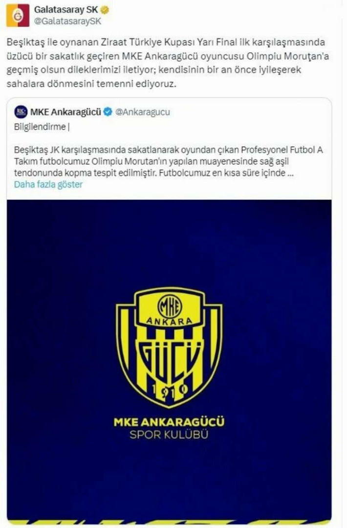 "Beşiktaş ile oynanan Ziraat Türkiye Kupası Yarı Final ilk karşılaşmasında üzücü bir sakatlık geçiren MKE Ankaragücü oyuncusu Olimpiu Morutan'a geçmiş olsun dileklerimizi iletiyor; kendisinin bir an önce iyileşerek sahalara dönmesini temenni ediyoruz" denildi.