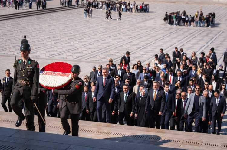 Bakan Bak başkanlığında, bakan yardımcıları, genel müdürler, gençler, sporcular ve diğer ilgililerden oluşan heyet, Aslanlı Yol'dan yürüyerek Gazi Mustafa Kemal Atatürk'ün mozolesine geldi. Bakan Bak'ın üzerinde "Gençlik ve Spor Bakanlığı" yazılı kırmızı-beyaz karanfillerle süslenmiş çelengi mozoleye bırakmasının ardından saygı duruşunda bulunuldu.
