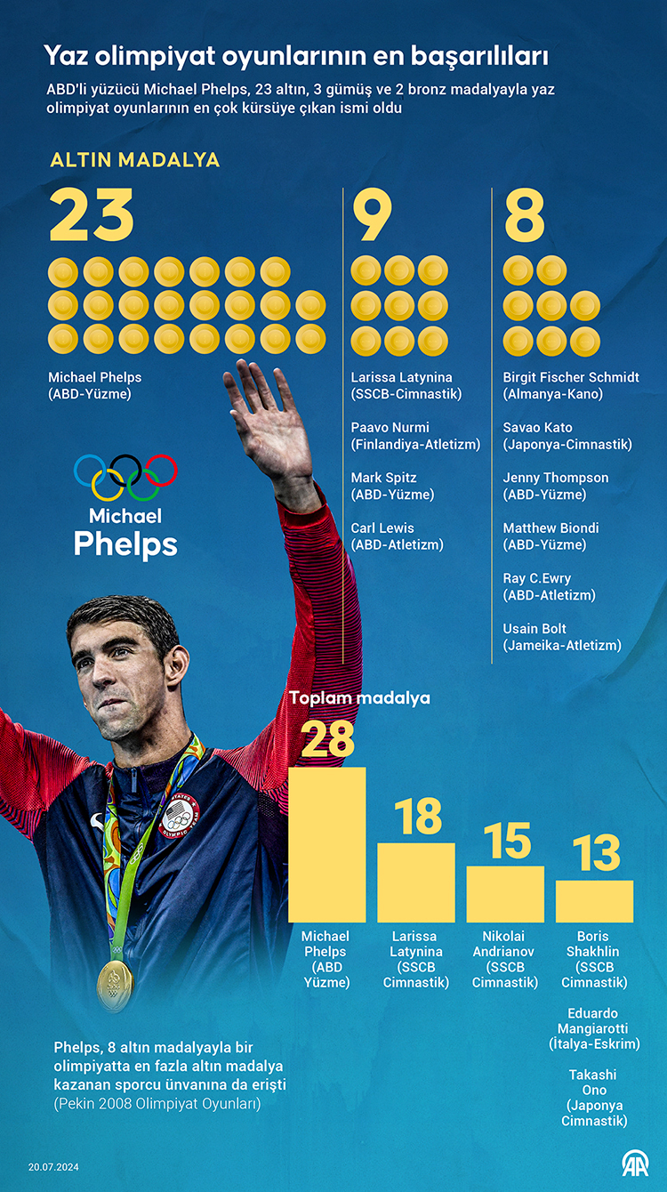 ABD'li yüzücü, 23 altın madalyayla oyunlar tarihinde kürsünün birinci basamağına en çok çıkan sporcu ünvanına da erişti.