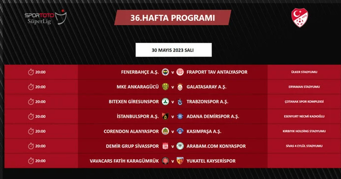 Yapılan açıklamaya göre; Fenerbahçe-Antalyaspor, Ankaragücü-Galatasaray, Giresunspor-Trabzonspor, İstanbulspor-Adana Demirspor, Alanyaspor-Kasımpaşa, Sivasspor-Konyaspor ve Fatih Karagümrük-Kayserispor maçları 30 Mayıs Salı günü saat 20.00'de oynanacak.