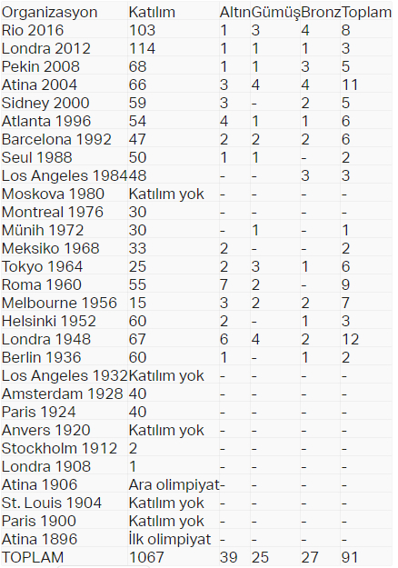Türkiye, olimpiyat oyunları tarihinde 39 altın, 25 gümüş, 27 de bronz madalya kazandı. Milli sporcular, olimpiyatlarda sadece 6 spor dalında başarılı sonuçlar elde etti.