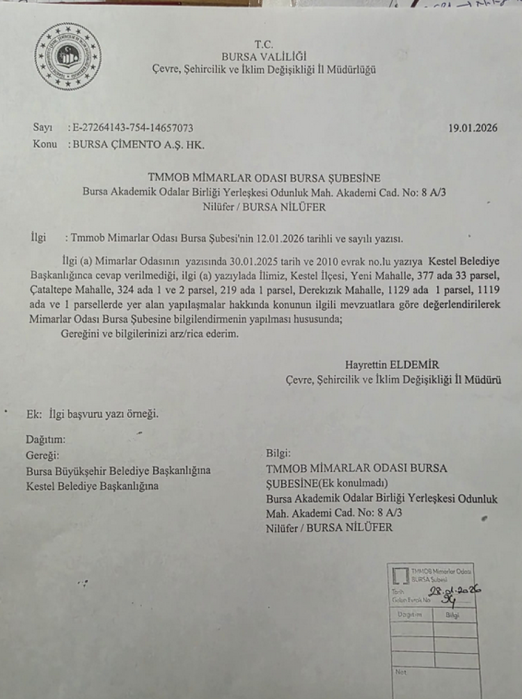 Ancak Mimarlar Odası, uzun süre taleplerine cevap alamayınca konuyu Çevre, Şehircilik ve İklim Değişikliği İl Müdürlüğü’ne taşıdı. İstenilen belgelerin yerel yönetimler tarafından verilmediği gerekçesiyle bakanlığa yazılan yazıya cevap geçtiğimiz günlerde geldi. 19 Ocak 2026 tarihli İl Müdürü Hayrettin Eldemir imzası ile dağıtımı yapılan yazıda konunun ilgili mevzuatlara göre değerlendirilerek Mimarlar Odası Bursa Şebisi’nin bilgilendirilmesi istendi. Bakanlık planların Mimarlar Odasına verilmesi yönündeki yazısını Büyükşehir Belediyesi ve Kestel Belediyesi’ne gönderdi.